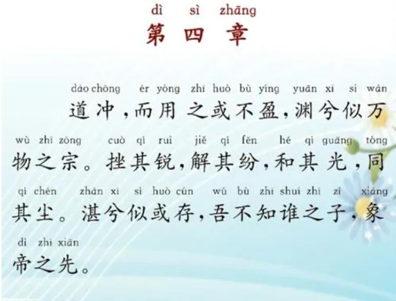 【原文】道冲,而用之或不盈①。渊兮,似万物之宗②;挫其锐,解其纷,和其光,同其尘,湛兮,似或存③。吾不知谁之子,象帝之先④。【注释】①冲:虚而不满的意思。盈:满的意思,引申为尽。②兮:语气词,可译为“啊”。③湛:没有、虚无的意思。④帝之先:天地的祖先,形容其出现之早。【译文】大道是空虚无形的,但它发