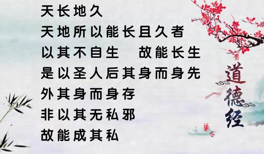 [原文]天长地久。天地所以能长且久者,以其不自生,故能长生。是以圣人后其身而身先;外其身而身存。非以其无私邪?故能成其私。[注释]①天长地久;长、久:均指时间长久。②以其不自生也:因为它不为自己生存。以,因为。③身:自身,自己。以下三个“身”字同。先:居先,占据了前位。此是高居人上的意思。④外其身:外,