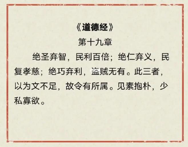 【原文】绝圣弃智①,民利百倍;绝仁弃义,民复孝慈;绝巧弃利,盗贼无有;此三者以为文不足②。故令有所属,见素抱朴,少私寡欲,绝学无忧。【注释】①圣:此处是指一种智能而言,不同于“圣人’’的圣。②文:文饰,浮文。【译文】抛却聪明和智巧,人民可以得到百倍的好处;杜绝仁慈,抛弃道义,人民才会回复到孝慈的本性