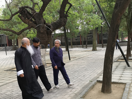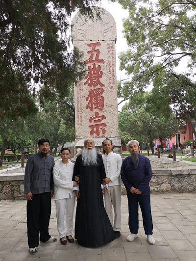 附图:文始派当代部分传承人合影(己亥年摄于泰山)。居中为宁象理先生,右一宁阳修,右二黄紫檀,左一于心本,左二段果敏。